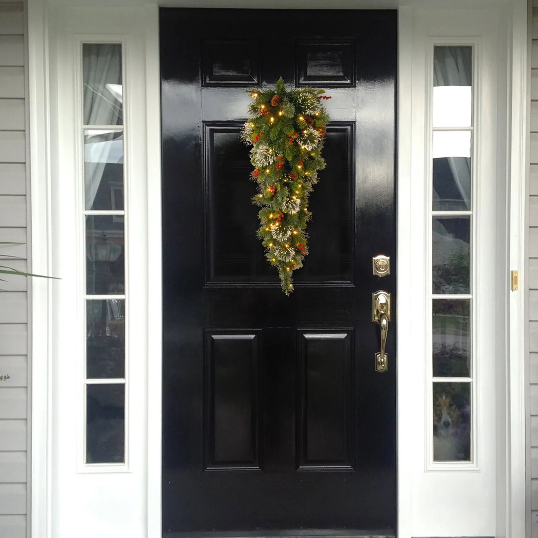 - Designed With A Wintry Pine Branch Base, This Pre-Lit Artificial Christmas Teardrop Is 36 Inches Long And Decorated With Pine Cones, Berry Clusters And Frosted Branches.