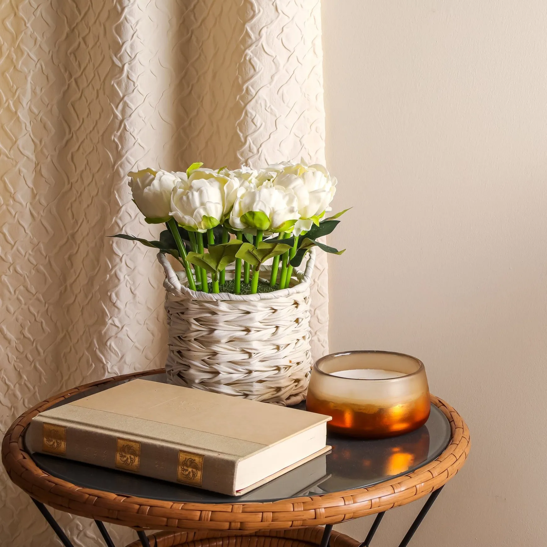 This Bouquet Of Bright White Peony Flower Blooms On Leafy Green Stems Rises From A White Basket With A Wide Weave And Two Loop Handles. The Flowers Are Seated In A Simulated Soil Surface. Add A Burst Of Color To Tabletop Trimmings With These Attractive Artificial Flowers That Are Remarkably Life-Like Yet Maintenance-Free. For Decorative Indoor Display.