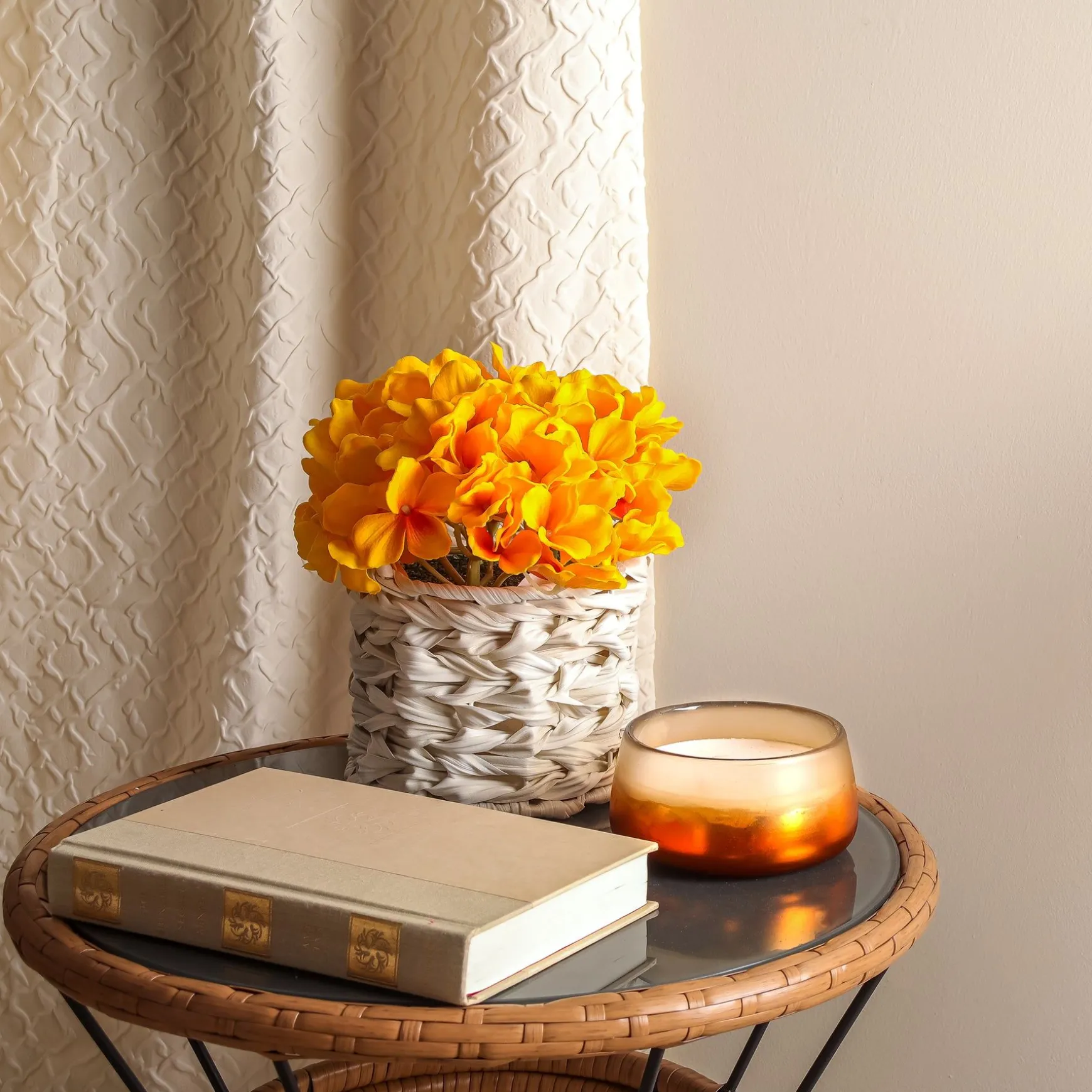 This Bouquet Of Yellow Hydrangea Flower Blooms Rises From A White Basket With A Wide Weave And Two Loop Handles. The Flowers Are Seated In A Simulated Soil Surface. Add A Burst Of Color To Tabletop Trimmings With These Attractive Artificial Flowers That Are Remarkably Life-Like Yet Maintenance-Free. For Decorative Indoor Display.