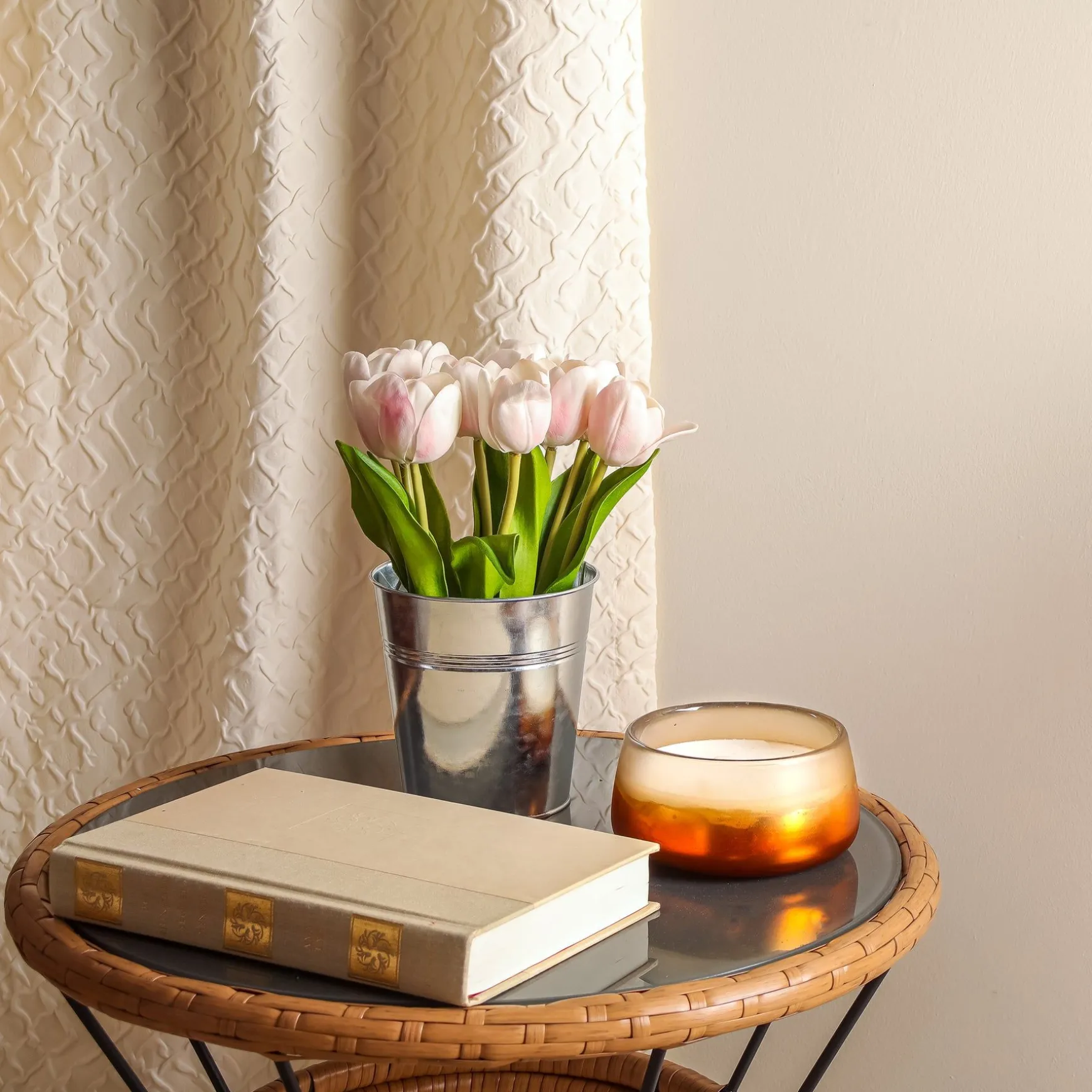 This Tight Bouquet Of Pink Tulip Blooms With Tall Leafy Stems Is Seated In A Round Metal Pot With A Soft Galvanized Finish And Embossed With Decorative Rings. Add A Rustic Flavor To Tabletop Trimmings With These Naturally Appealing Artificial Flowers That Are Remarkably Life-Like Yet Maintenance-Free. For Indoor Display.