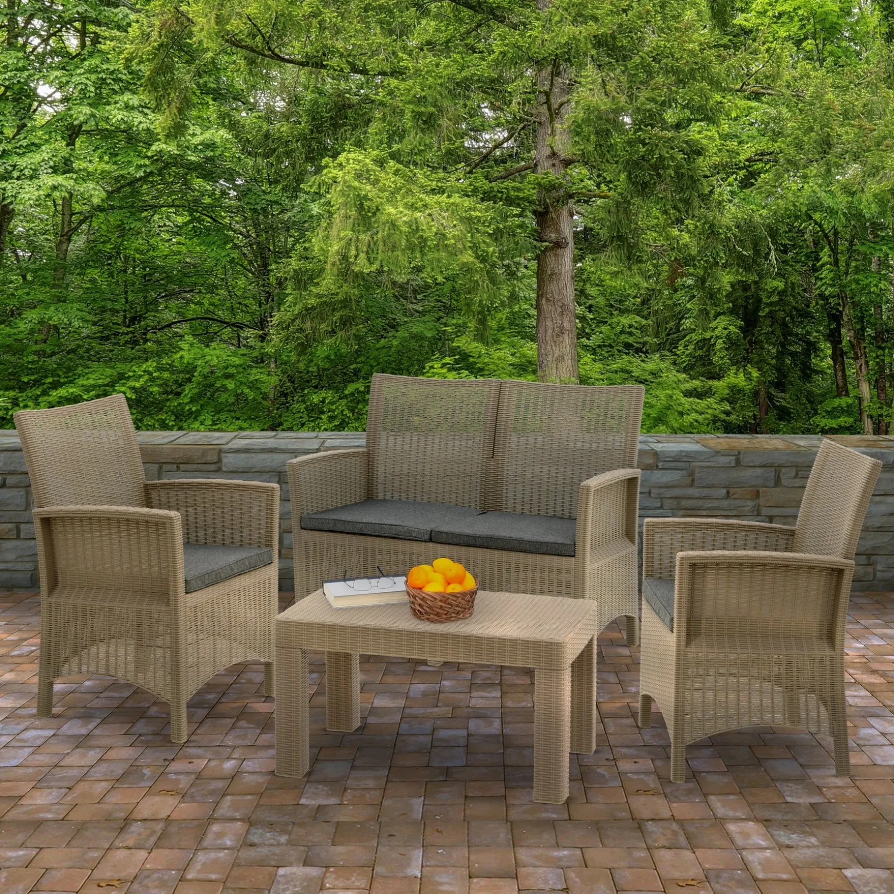 This Indoor/Outdoor Conversation Set Is Constructed Of High Strength Injection Molded Polypropylene Material That Is Durable, Weather-Resistant And Long Lasting. Each Piece Features A Wicker Weave Textured Finish In A Light Gray Color, All Designed To Withstand Harsh Outdoor Elements. Pieces Will Not Unravel, Fray Or Fade. Comfortable, Complementing Gray Seat Cushions Are Removable And Fashioned With Water, Mildew And Fade-Resistant Fabric. This Sturdy Yet Lightweight Set Includes A Loveseat And Two Chairs All With Relaxed-Back Seating And Armrests, And A Rectangular Coffee Table. Pieces Are Easy To Maintain And Care For. Assembly Required.