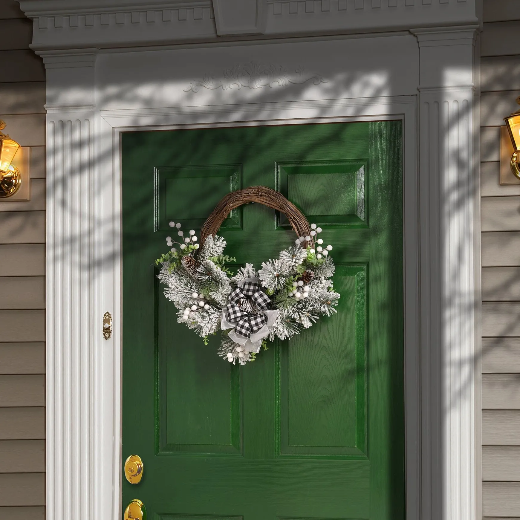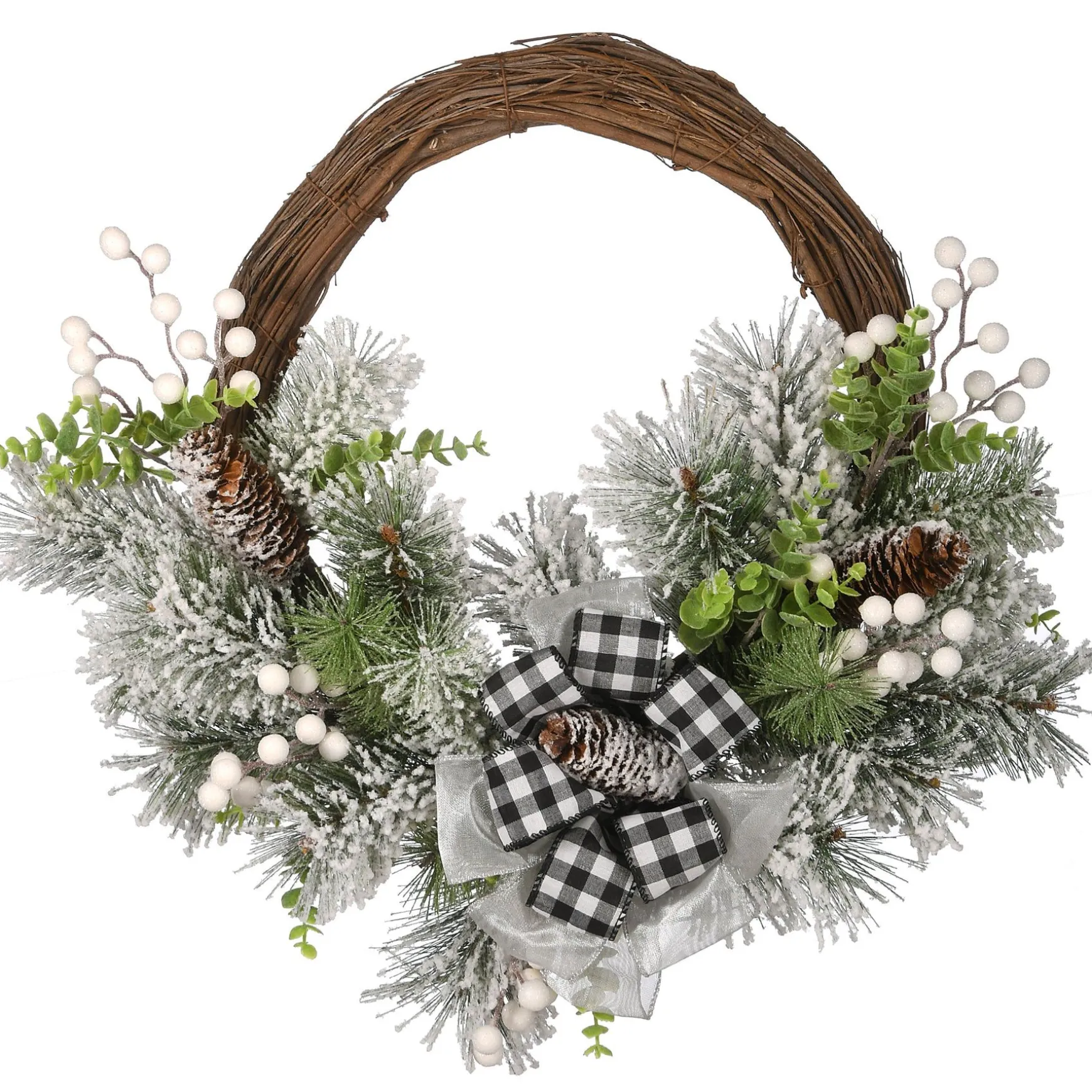 This Wreath Features A Thick Woven Branch Twig Ring Base Decorated With Snow-Sprinkled Evergreen Branch Tips. Mixed In Are Leafy Green Sprigs, Pinecones And White Berry Clusters. A Combined Checkered Fabric And Silver Lace Bow Creates The Finishing Touch For This Decorative Wall Hanging. Display This Rustic Wreath On Doors, Walls And Windows In Indoor Or Covered Outdoor Locations.