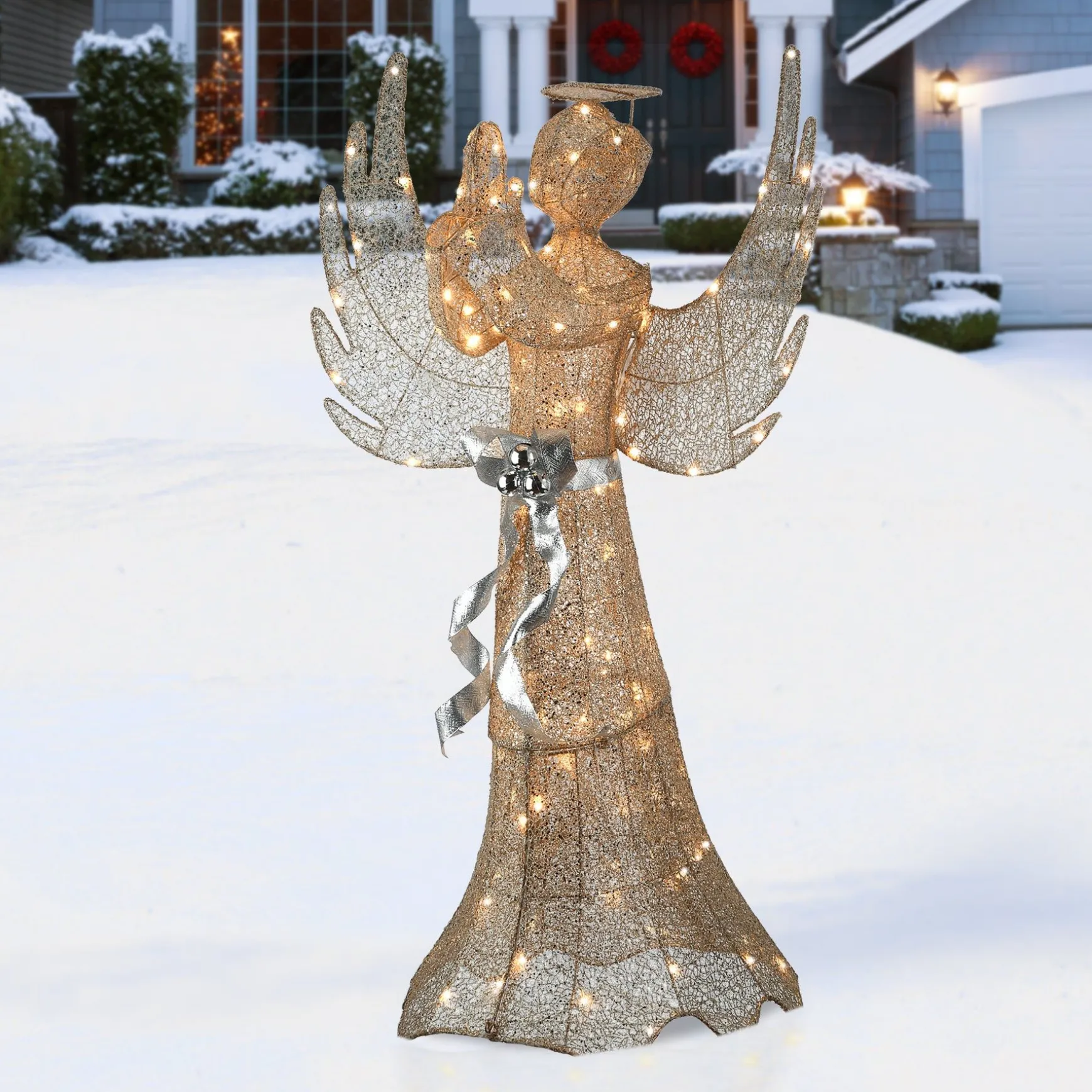This Praying Angel Figure With Halo Is Constructed Of Glittered Sisal Mesh Material Wrapped Around A Wire Frame Creating A Strong And Durable Holiday Trimming. It Is Pre-Lit With 120 Energy-Efficient Multicolor Led Lights That Make This Decoration Sparkle And Shine. Angel Is A Champagne Gold Color With A Bright Silver Ribbon And Bow Belt With Ball Ornaments. Display This Decorative Holiday Piece In Indoor Or Outdoor Locations.