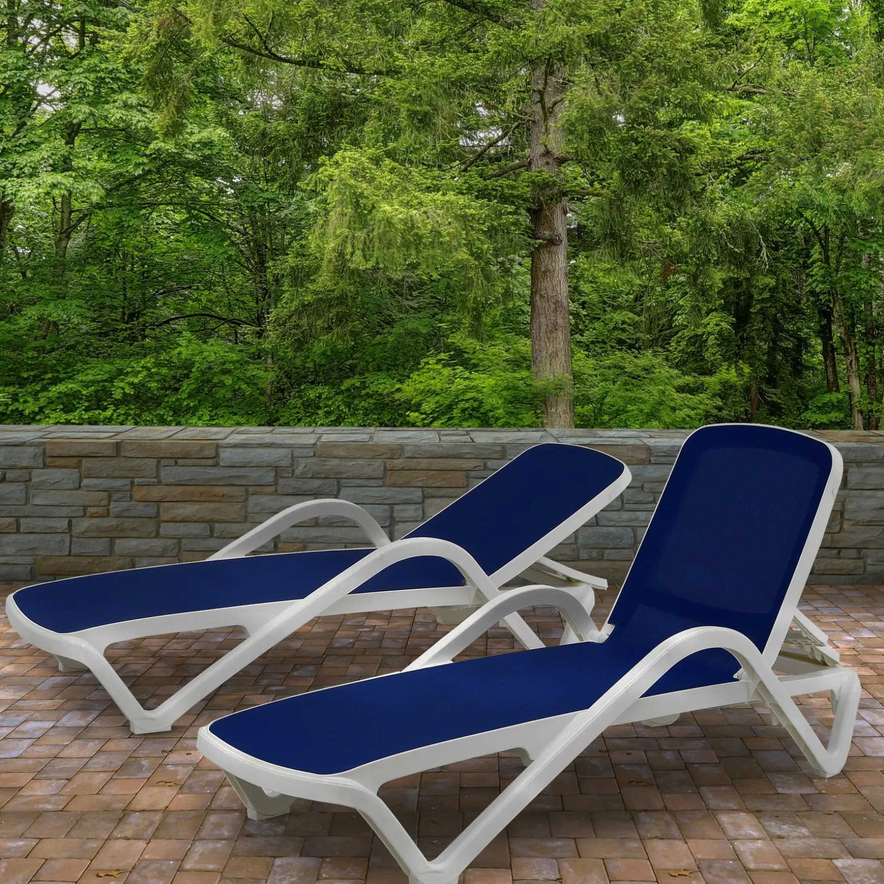 Soak Up The Sun Or Just Lay Back And Relax In These Contemporary Styled Sling Chaise Lounges With Armrests, In Contrasting White And Navy-Blue Colors. Offering Four Back Positions Including A Lay Flat Option, The Frames Of Each Are Constructed Of High Strength Injection Molded Polypropylene Material That Is Durable, Weather-Resistant And Long Lasting. Designed For Comfort, The Textelene Sling Material Is Firm, Breathable And Supportive. Strong Yet Lightweight, These Stackable Loungers Are Easy To Pick Up To Move, Rearrange And Store. Uv Treated To Resist Fading. No Assembly Required.