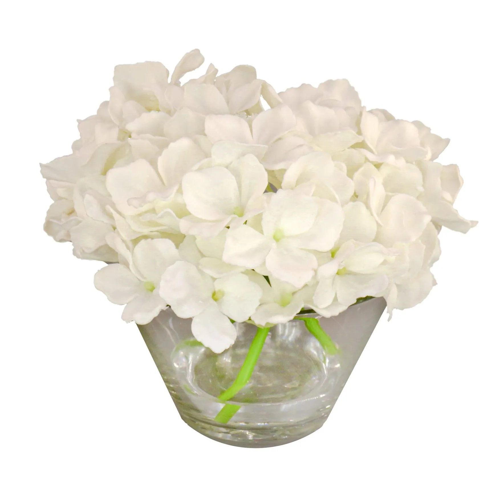 This Tight Bouquet Of White Hydrangea Flower Blooms Is Seated In A Round Clear Glass Vase With Their Green Stems Resting In A Simulated Pool Of Water. Add A Burst Of Color To Tabletop Trimmings With These Attractive Artificial Flowers That Are Remarkably Life-Like Yet Maintenance-Free. For Decorative Indoor Display.
