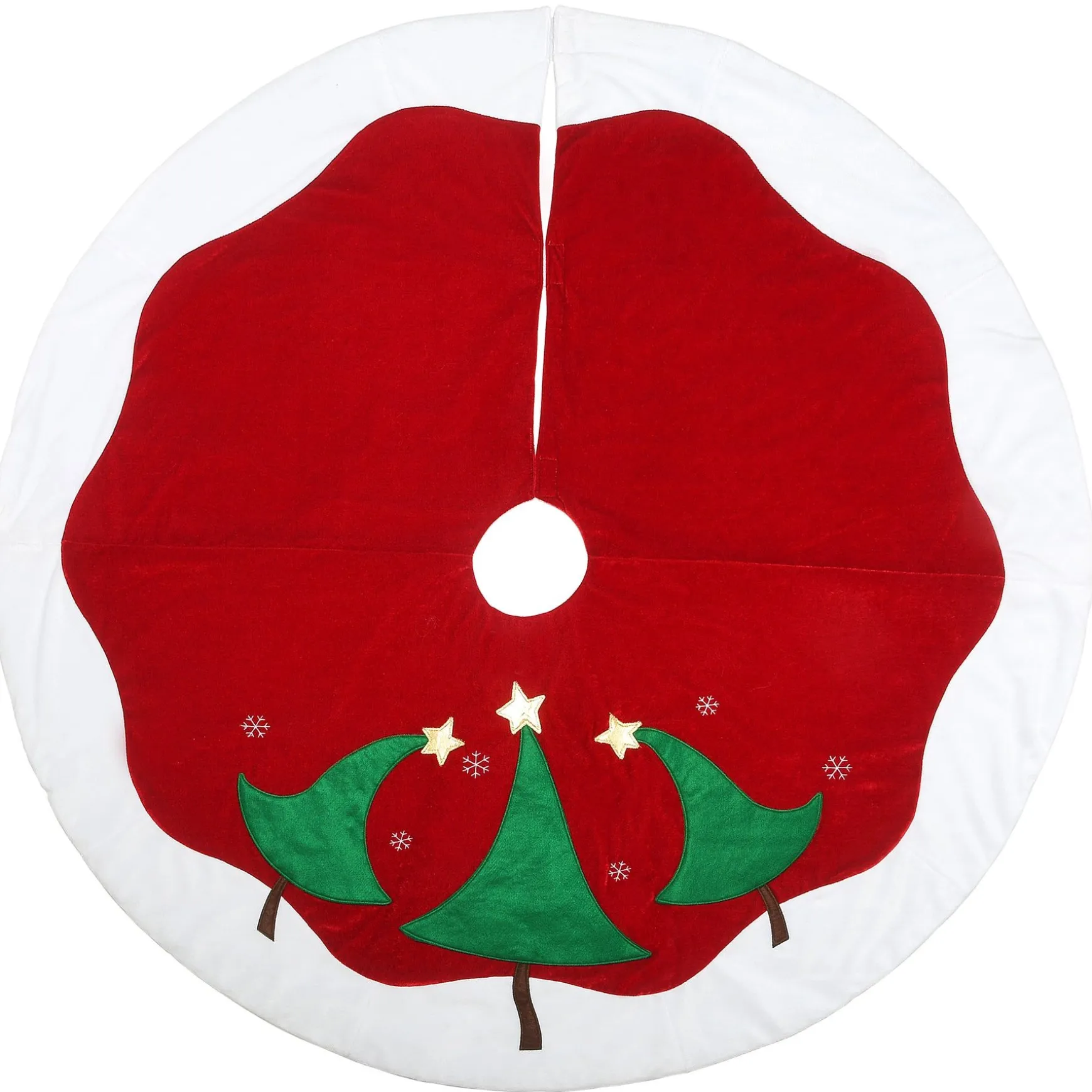 Add The Finishing Touch By Surrounding The Base Of Your Christmas Centerpiece With This Brightly Colored Tree Skirt. Made Of 100% Polyester, This Vibrant Red Skirt Features A Decoration Of Three Star-Topped Green Trees That Seem To Dance As They Sprout Up From Rolling Mounds Of Snow Fashioned Along The Border. The Split Seam Design Allows For Easy Placement With Velcro Tabs Included To Close And Secure The Seam.