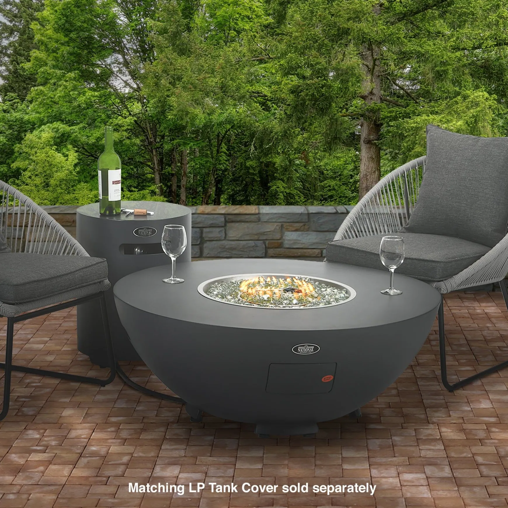 The Clean Lines And Contemporary Style Of This Low-Profile Fire Pit Table Make A Bold Statement While Utilizing An Architectural Design Concept. This Sturdy Bowl Shape Fire Pit Table Is Constructed Of Rust-Resistant Powder-Coated Aluminum With A Concrete-Like Gray Matte Finish. Flame Height Control Knob Is Located In A Recessed Opening On The Table Side Wall. Clear Polished Glass Beads Included To Cover The Burner. Reliable Match Light Ignition Included. Propane Tank Sold Separately.