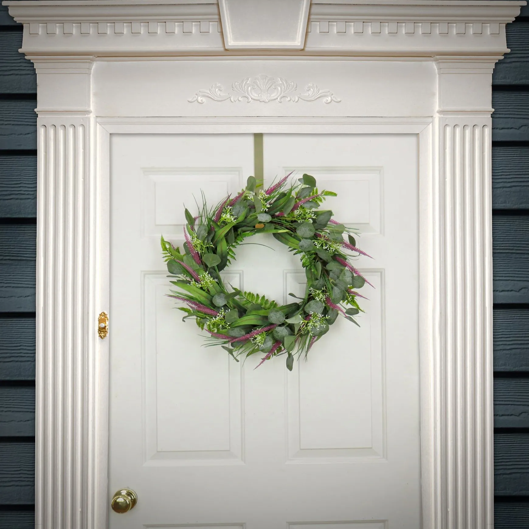 - This Artificial Wreath Decoration Is Decorated With Green Eucalyptus Leaves, Lavender And Flowing Green Stems.